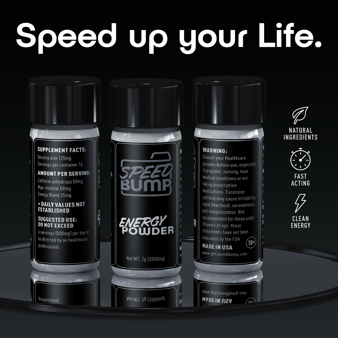 Meet Speedbump Energy Powder—pure power in every bump. With 50mg of caffeine and 50mg of inositol per serving, it delivers explosive energy with a clean, steady lift and no hard crash. Built for those who push limits, this is energy that keeps up with your grind.